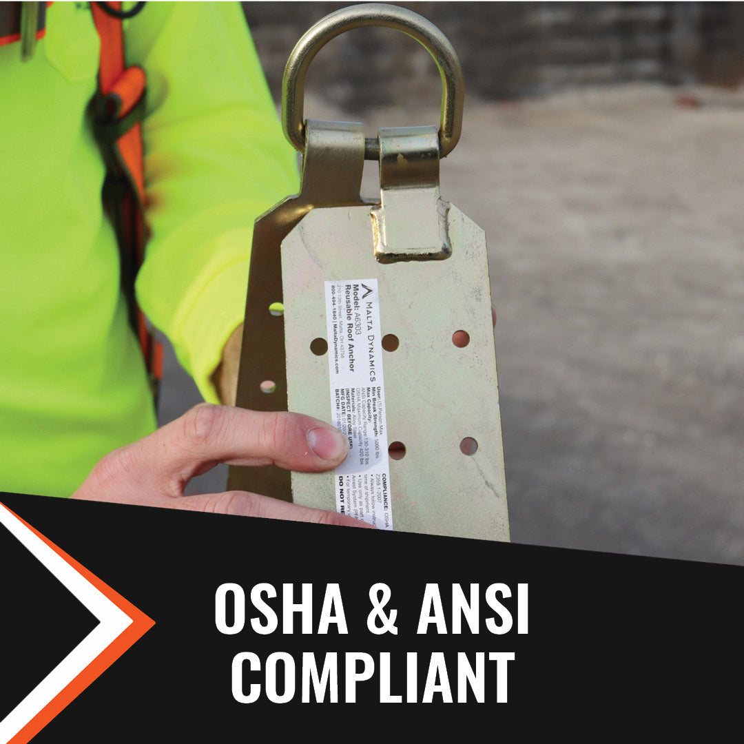 The Personal Fall Arrest Systems (PFAS) and Fall Restraint Systems used while working at heights usually include fall arrest roof anchors. The Malta Dynamics Reusable Roof Anchor is a 21” reusable heavy-duty roof anchor with two moveable legs and a steel D-Ring. These fall arrest roof anchors weigh only 2.4 lbs. and are designed with a discreet profile that’s easy to transport. This reusable roof fall protection anchor is designed for temporary use on wood rooftops and fits a range of roof pitches from flat to 12/12. The thick zinc plated steel construction gives this reusable roof anchor system a long life and is ideal for supporting workers ranging from 130-310 lbs.